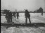 WORKERS CUTTING BLOCKS OF ICE FROM LAKE & PLACING IT ON TRACTOR-POWERED CONVEYOR TO ICE HOUSE.