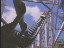 Tilt up on window washers cleaning window from a long platform way up high, a cable runs diagonally across the frame.