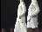 WHITE SUITS WITH LONG PLEATED SKIRTS, FASHION MODELS ON RUNWAY, LINEN SUITS, FASHION PHOTOGRAPHERS AT WORK, SHEER BLOUSES, WHITE GLOVES
