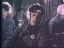 FOUR CHARACTERS IN RAINCOATS HUDDLE IN RAIN.