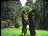 WS OF BEAUTIFUL GROUNDS OF ESTATE, MANM IN YELLOW TIGHTS SHAKES HANDS WITH MAN WITH DUCK BEAK AND FLIPPERS