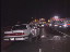 Emergency vehicles parked along highway at scene of accident, lights flashing, nighttime